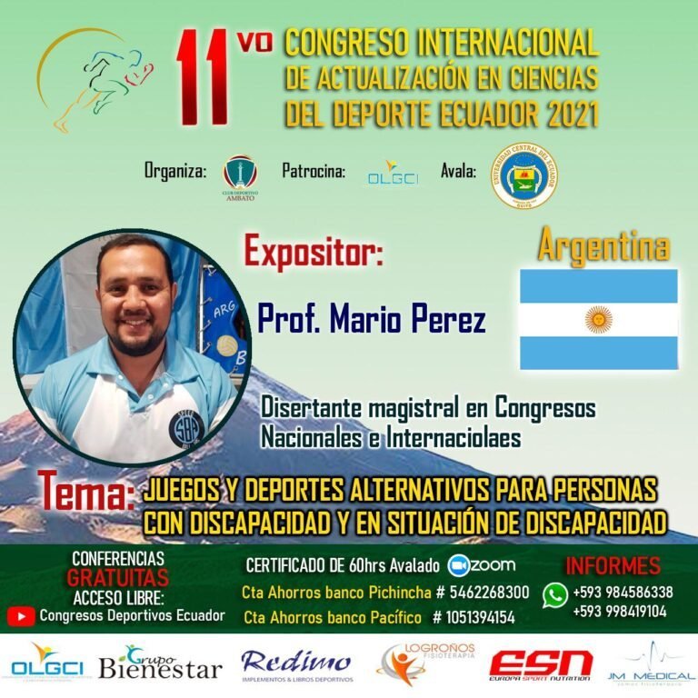 El profesor Mario Perez disertó también el pasado sábado 24 con «Juegos Alternativos en Épocas de Pandemia» para un total de 300 profesionales latinoamericano en lo que fue un gran éxito, mientras que este jueves 29 hizo una nueva presentación con la temática «Juegos y Deportes Alternativos para Personas con Discapacidad y en Situación de Discapacidad». Incluyendo en la misma el deporte alternativo de su creación Speed Ball – Arg