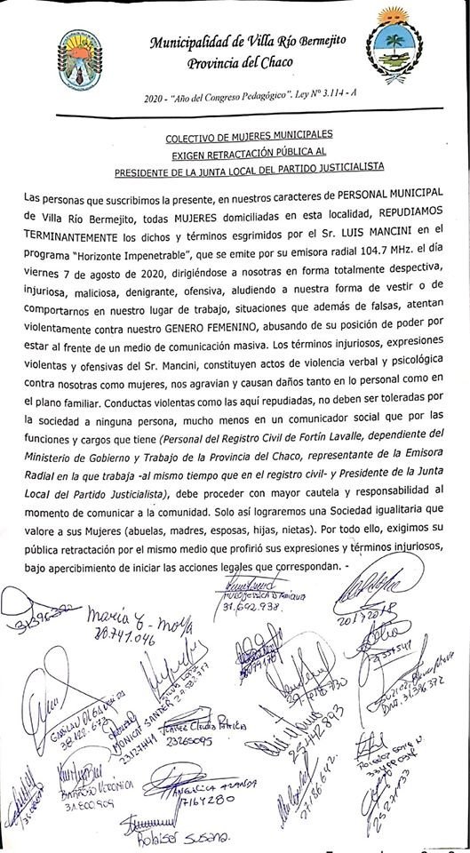 • Que ratificamos nuestro repudio a los dichos vertidos por el comunicador Luis Alberto Mancini en su espacio radial (104.7 Mhz), debido a que sus manifestaciones resultan lesivas hacia nuestra condiciรณn de mujeres.