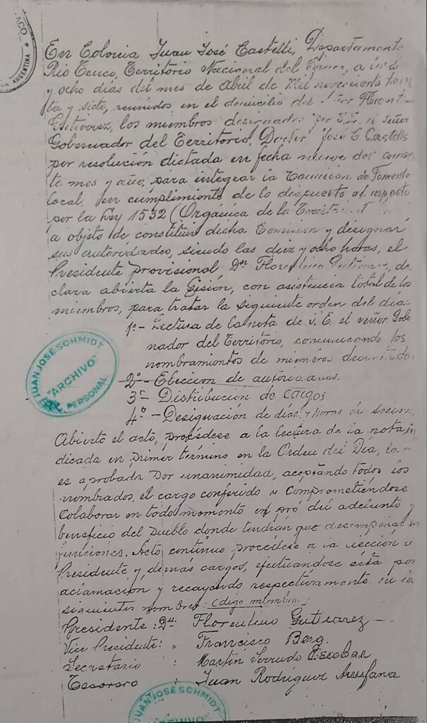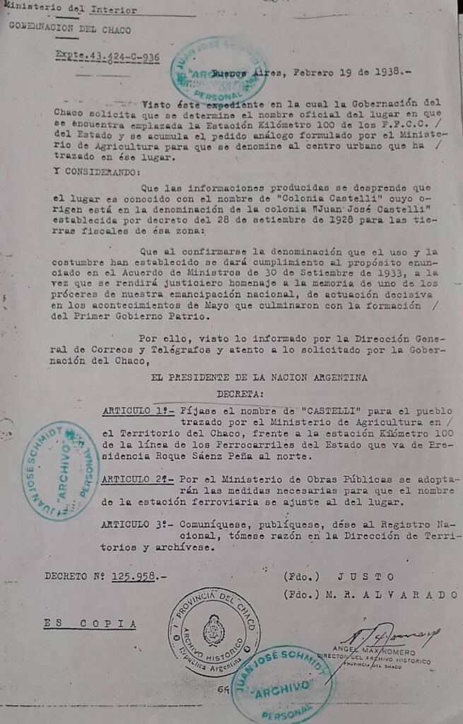 Efemérides de Castelli: el 19 de febrero de 1938 Castelli nacía como pueblo (recibía su documento). Si bien los castelenses celebramos el 03 de octubre de 1936 como fecha fundacional (día que se entregaban las primeras escrituras), el 19 de febrero es una fecha a tener en cuenta por el significado histórico de un decreto presidencial donde se define oficialmente como pueblo al caserío formado en el punta de riel (km 100 de Sáenz Peña al norte) y es reconocido como «CASTELLI». (Fuente: Historiador Juan Jose Schmidt )