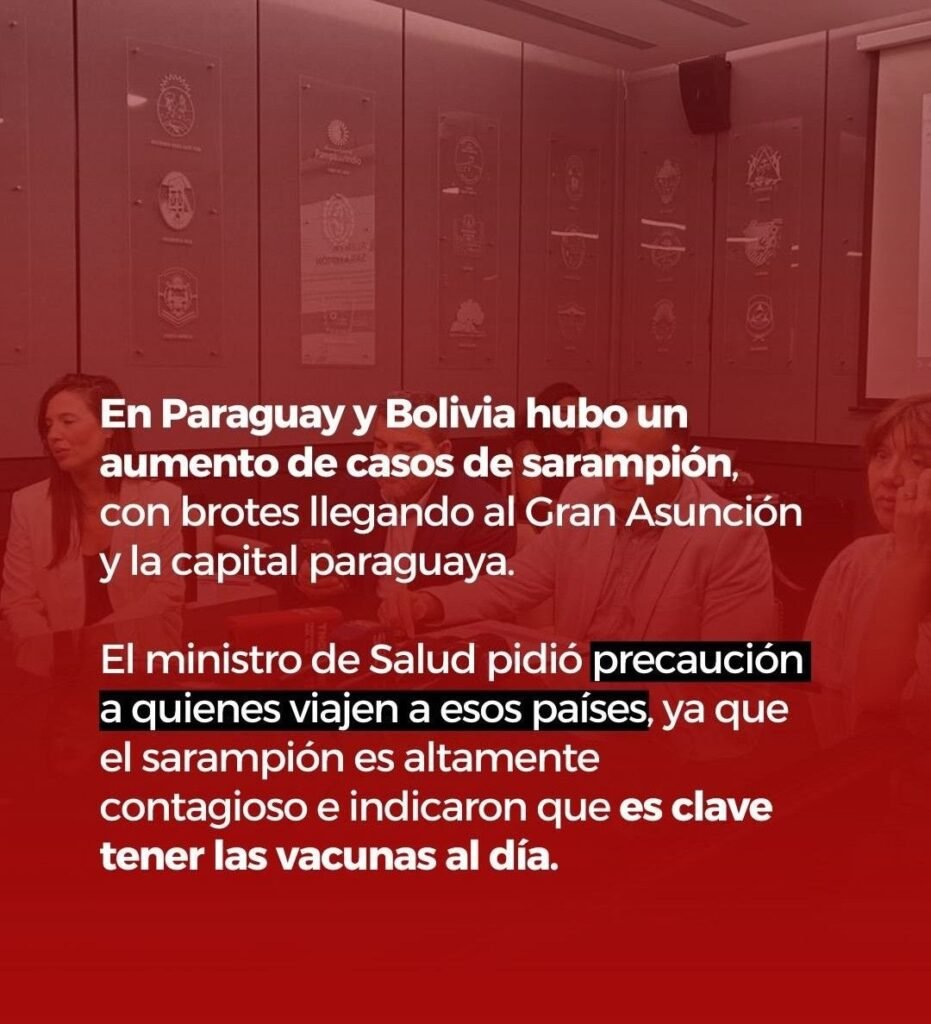 El ministro de Salud informó sobre un aumento de casos de sarampión en Paraguay y Bolivia, con brotes que podrían afectar a viajeros. El sarampión es altamente contagioso, y las autoridades llaman a tomar recaudos y estar atentos a los síntomas.