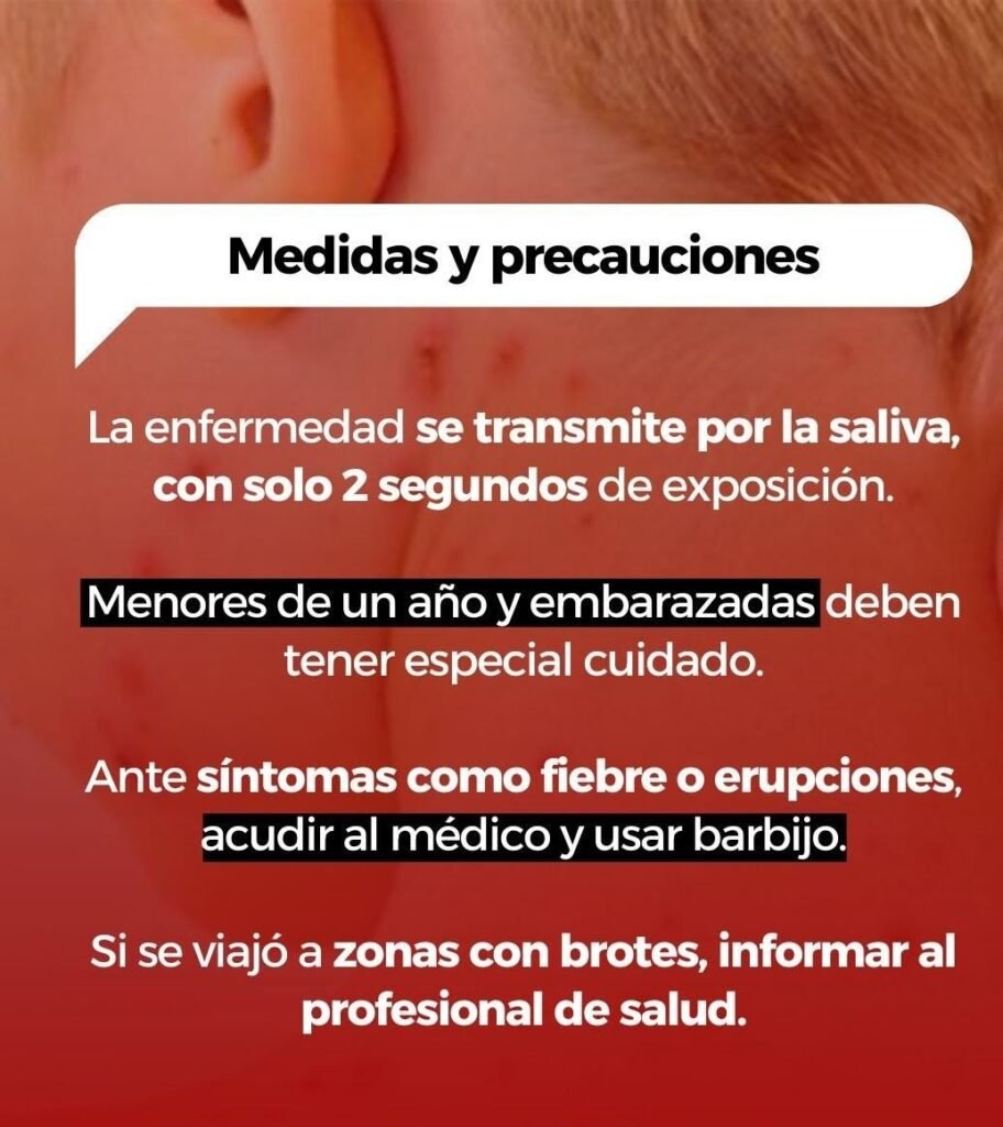 👶⚕️ Precauciones especiales: menores de un año y embarazadas deben extremar cuidados, ya que no pueden vacunarse. Ante fiebre, erupciones o viajes recientes a zonas con brotes, acudir al médico y usar barbijo.