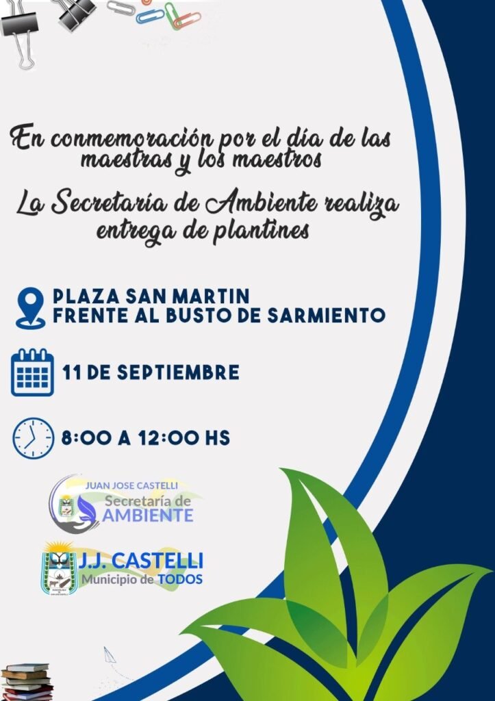 En el marco del Día del Maestro la Secretaría de Ambiente a cargo del Prof Enzzo Ferrari hará entrega de plantines. La actividad se llevará a cabo frente al Busto de Sarmiento ubicado en la Plaza San Martín por la calle Sarmiento. Solicitan llevar botellas descartables para canjear por los plantines.