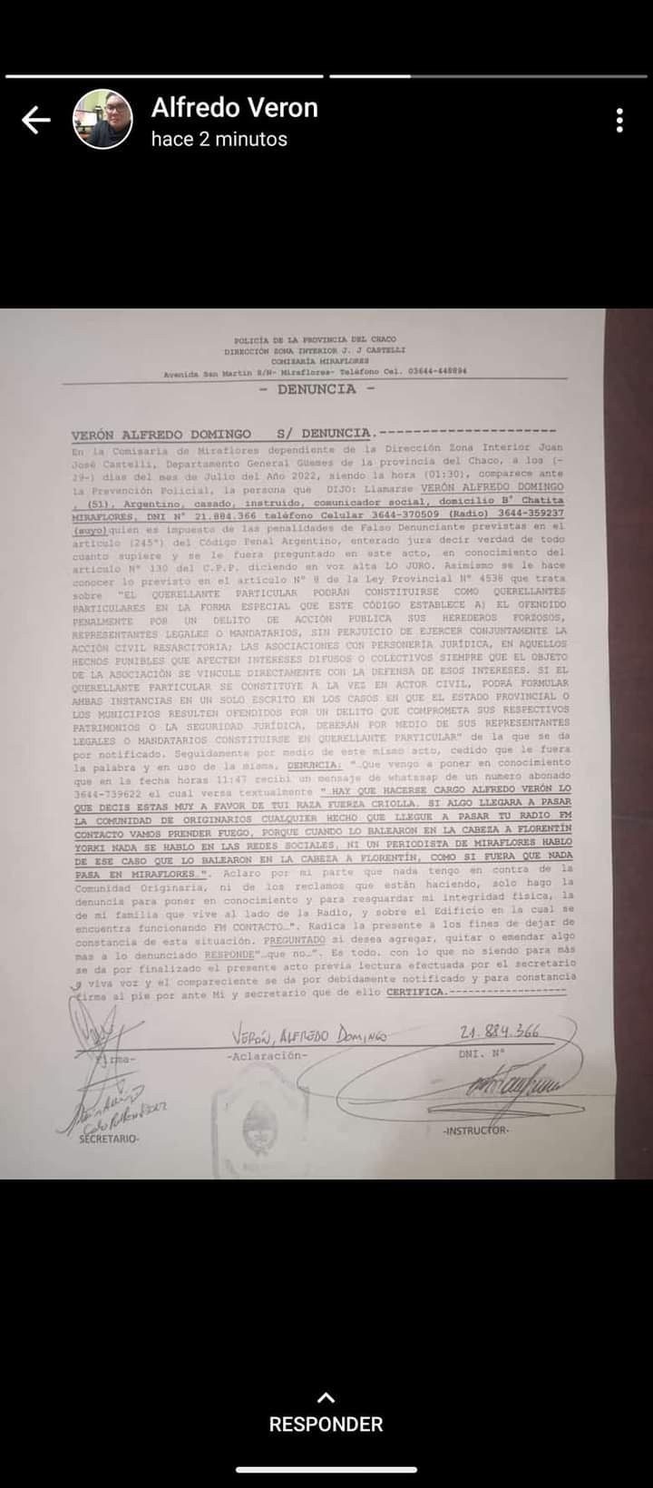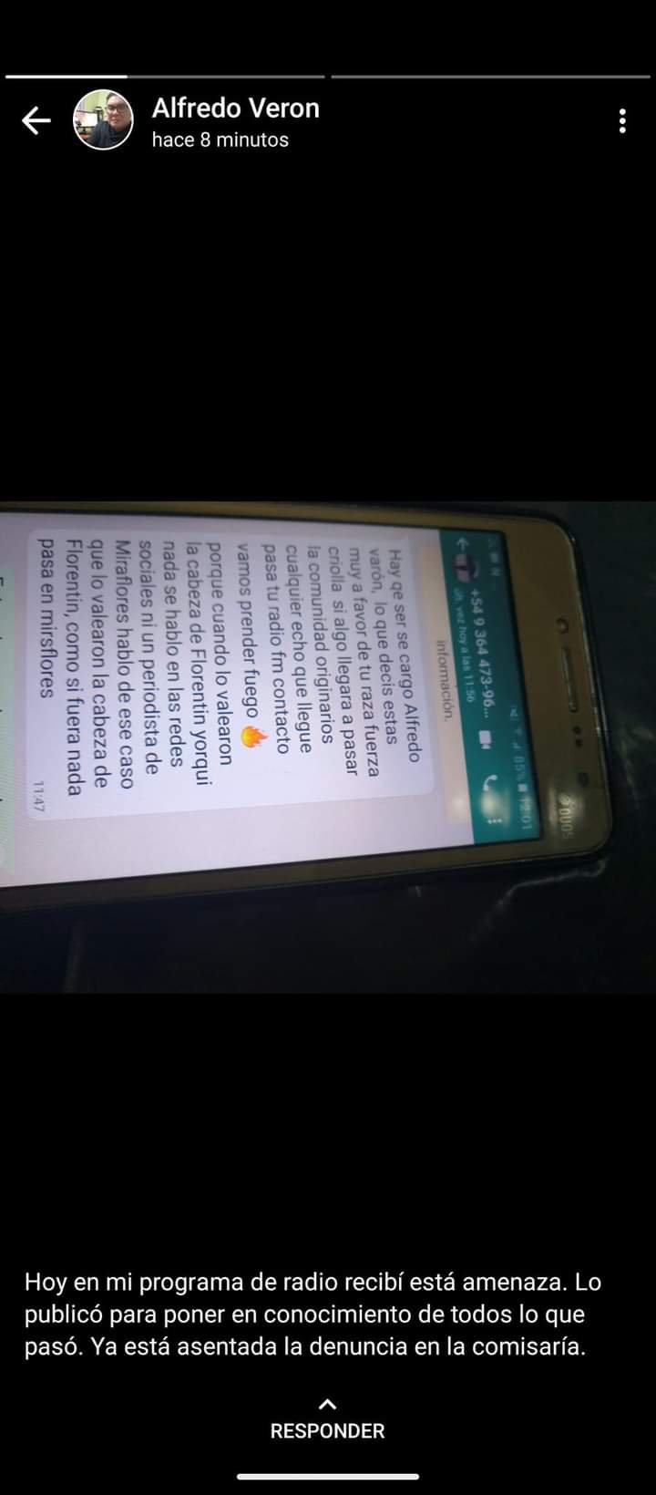 El Comunicador Social Alfredo Verón propietario de Fm Contacto puso mediante capturas de WhatsApp los mensajes intimidatorios que recibió en el día de la fecha.