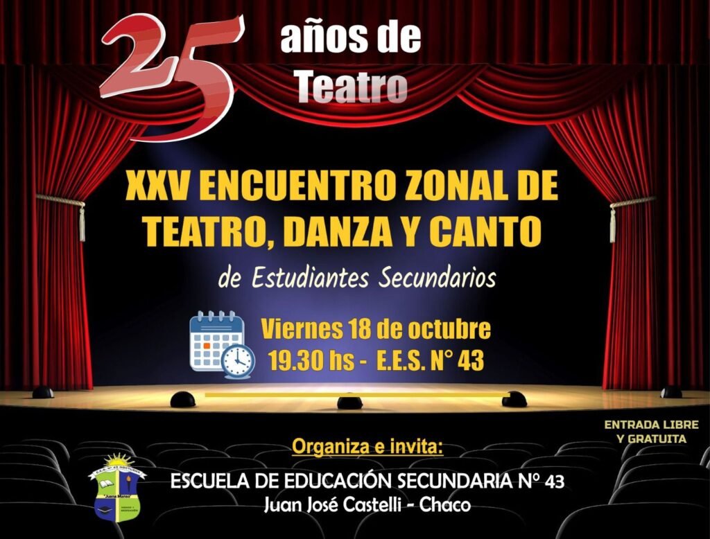 Este viernes desde las 19:30 horas se realizará la XXV edición del Encuentro Zonal de Teatro, Canto y Danza en la Escuela de Educación Secundaria N° 43.