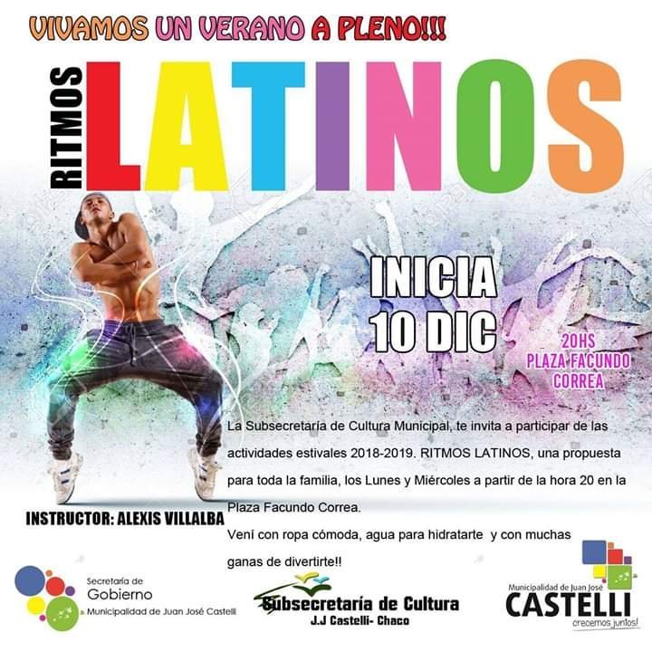 RITMOS LATINOS: Inicia el próximo lunes 10 de diciembre a partir de la hora 20 en la plaza Facundo Correa a cargo del instructor Alexis Villalba. Es muy importante que todos aquellos que participan de esta actividad, lleven agua para hidratarse.