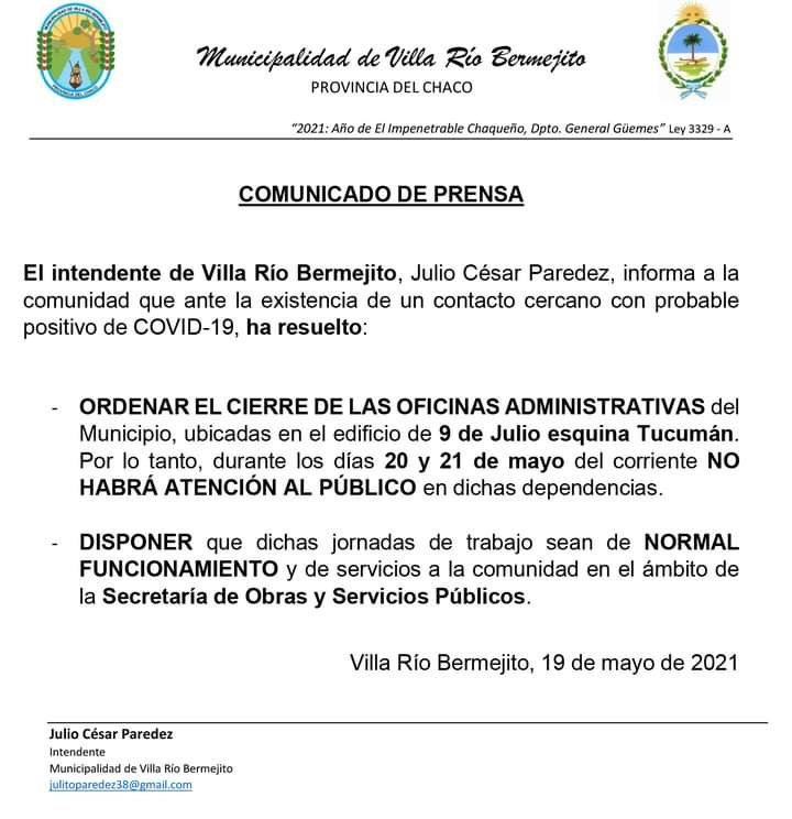 El intendente de Villa R铆o Bermejito, Julio Paredez, dispuso el cierre preventivo de las oficinas administrativas del Municipio durante los d铆as JUEVES 20 y VIERNES 21 debido a contacto cercano de uno de los empleados con probable caso positivo de COVID-19.