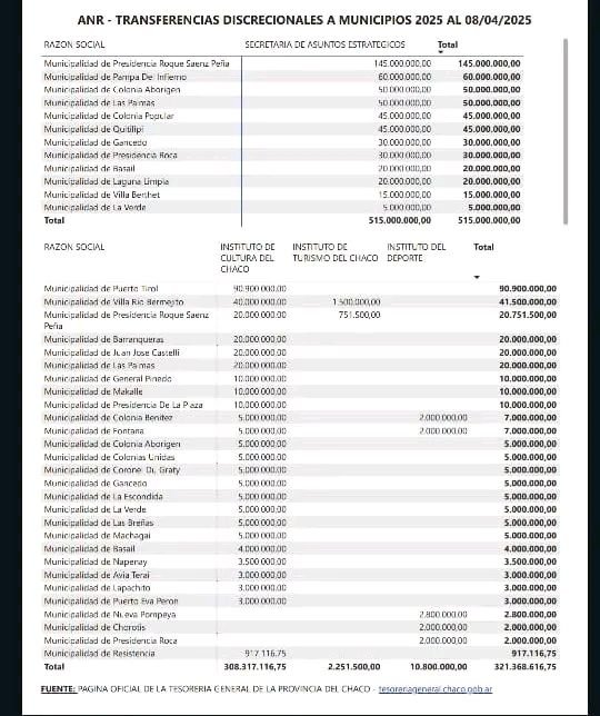 El Municipio de Villa Río Bermejito, como asi los otros municipios detallados al pie, recibieron un aporte del Instituto de Cultura de la provincia del Chaco un anticipo no reintegrable.