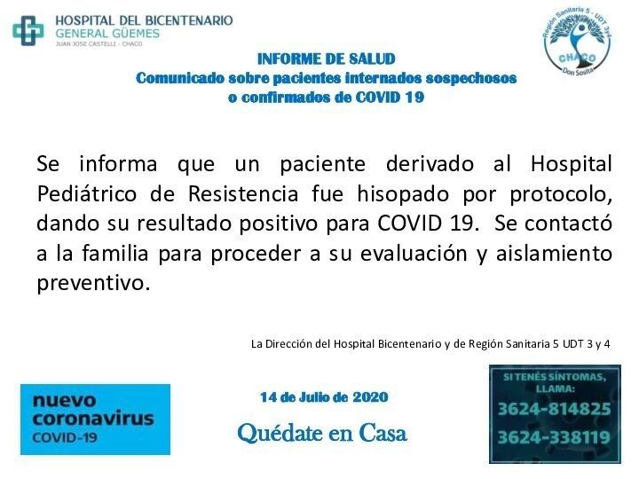 Se trata de un Paciente Pediátrico que llegó a la Guardia del Hospital del Bicentenario el sábado 11 de julio y fue diagnosticado con Abdomen Agudo Quirúrgico. Tras permanecer algunas horas en la Guardia fue deribado a Resistencia donde se le realizó el Hisopado el dÃa 12 de julio este 13 de julio por la noche los resultados dieron Positivo para COVID-19.
