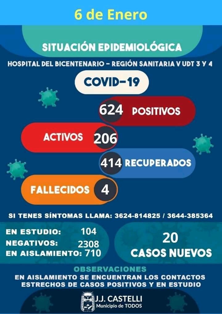 Con los 20 nuevos positivos de este miércoles 06 de enero, CASTELLI contabiliza 624 positivos desde el inicio de la pandemia de los cuales 206 son activos, 414 recuperados y 4 personas fallecieron.