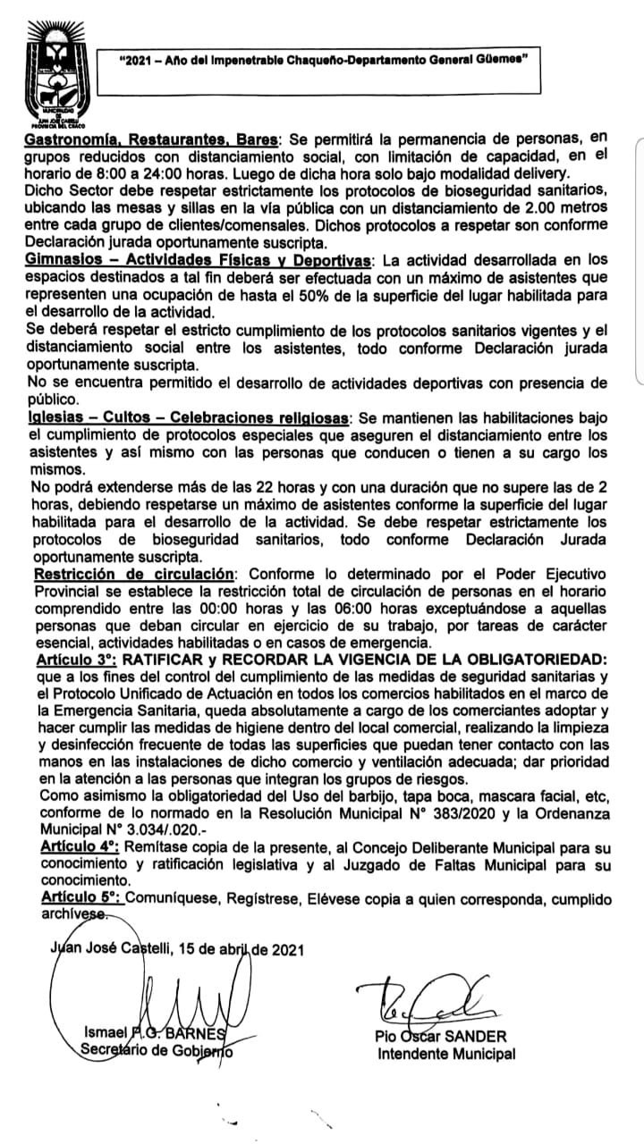 Artículo 2°: DISPONER las siguientes medidas de restricción y recomendación a aplicarse en todo el ejido Municipal y Jurisdicción de Juan José Castelli, las que tendrán vigencia hasta el 30 de abril del corriente año.