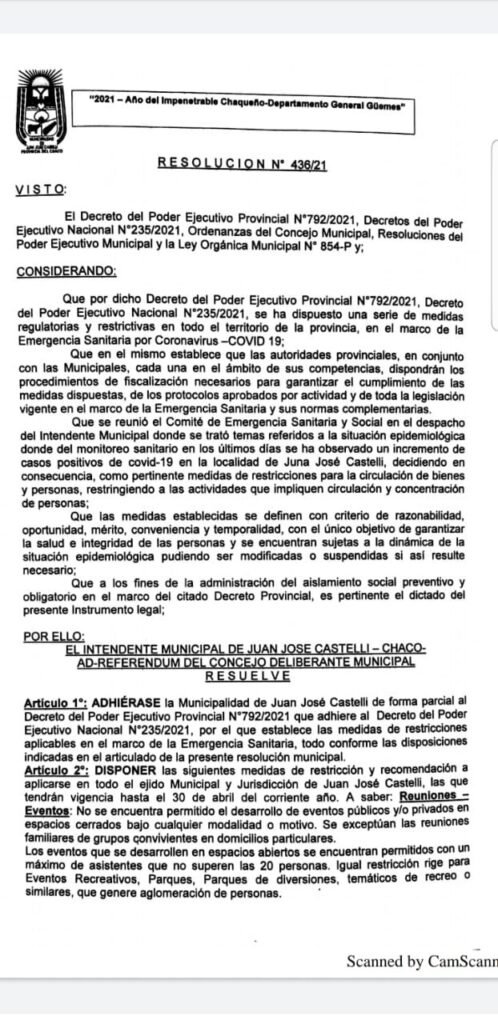 Artículo 1°: ADHIÉRASE la Municipalidad de Juan José Castelli de forma parcial al Decreto del Poder Ejecutivo Provincial N°792/2021 que adhiere al Decreto del Poder Ejecutivo Nacional N°235/2021, por el que establece las medidas de restricciones aplicables en el marco de la Emergencia Sanitaria, todo conforme las disposiciones indicadas en el articulado de la presente resolución municipal.
