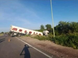 CASTELLI – CAMIÓN QUE TRANSPORTABA COMBUSTIBLE HACIA VILLA RIO BERMEJITO NO VIO LAS SEÑALES Y CAYÓ AL CANAL