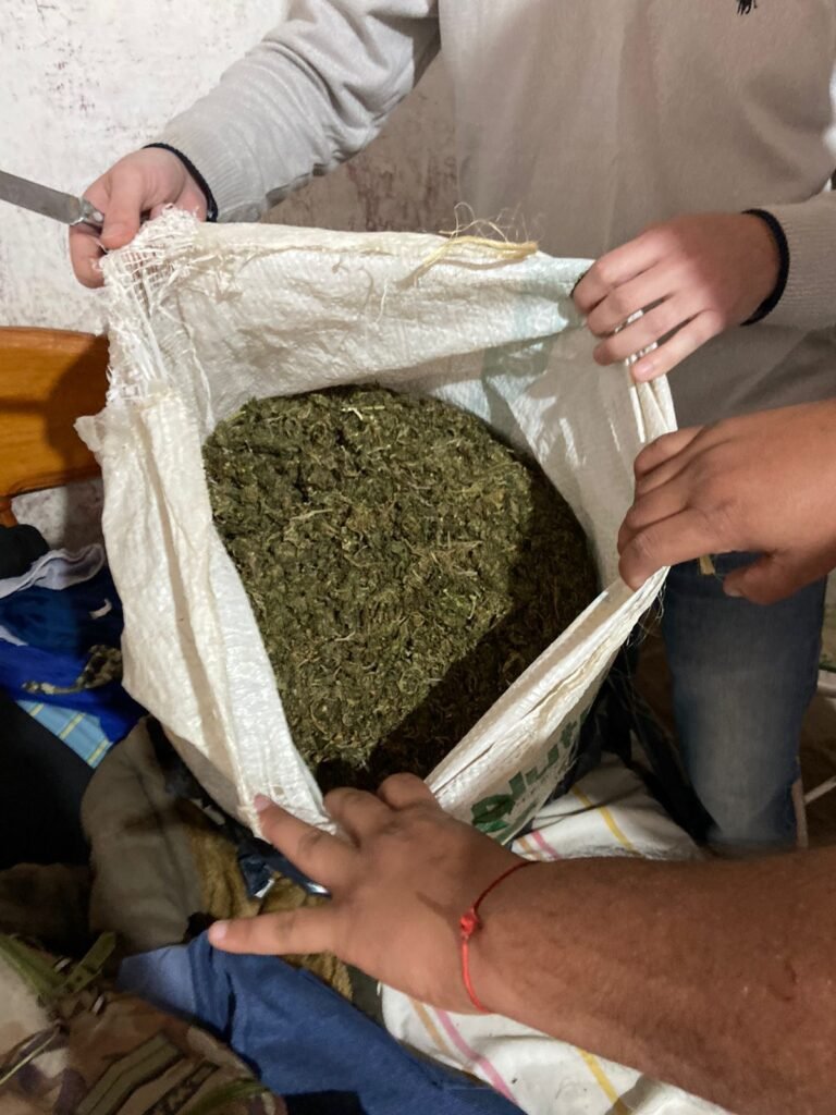Como resultado de ello, se encontraron una bolsa arpillera grande repleta de cogollos de marihuana y otra similar totalmente cerrada y encintada.