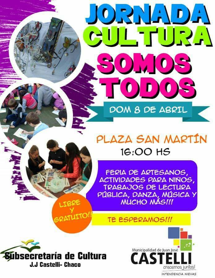Bajo el lema «Cultura Somos Todos», la Subsecretaría de Cultura a cargo de Estela Almirón, inicia las jornadas artísticas en la Plaza San Martín desde este domingo 8 de abril a la hora 16, LIBRE Y GRATUITA.