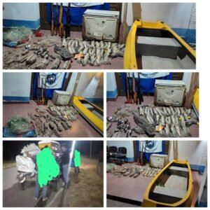 Los agentes realizaron una inspección sobre las pertenencias que poseían, hallando un total de 13 piezas de pescados, 21 cimbras de piolín de diferentes medidas, cinco reels, tres señuelos diferentes colores respectivo ganchos, una conservadora, una canoa, una red, dos linternas, dos escopetas, una calibre 12 y la restante calibre 16. Además de dos aires a comprimido, uno modificado a calibre 22 y el otro calibre 5,5.