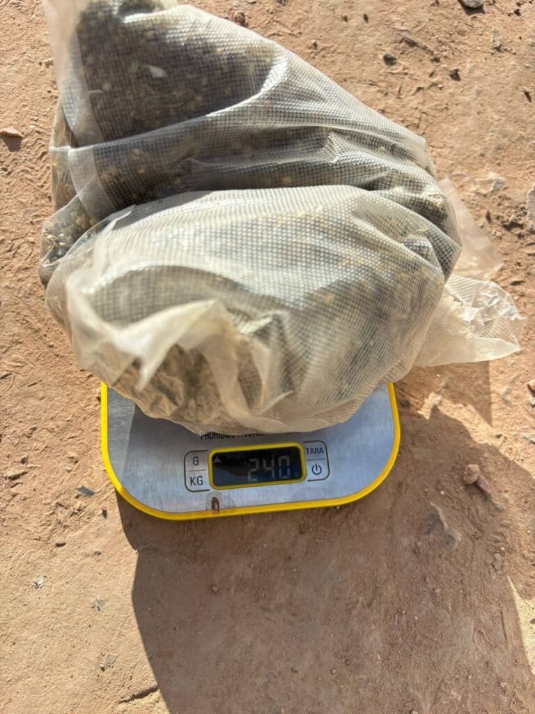 • Un paquete de nailon con una sustancia vegetal que, tras las pruebas de campo, dio positivo para marihuana con un peso de 240 gramos.