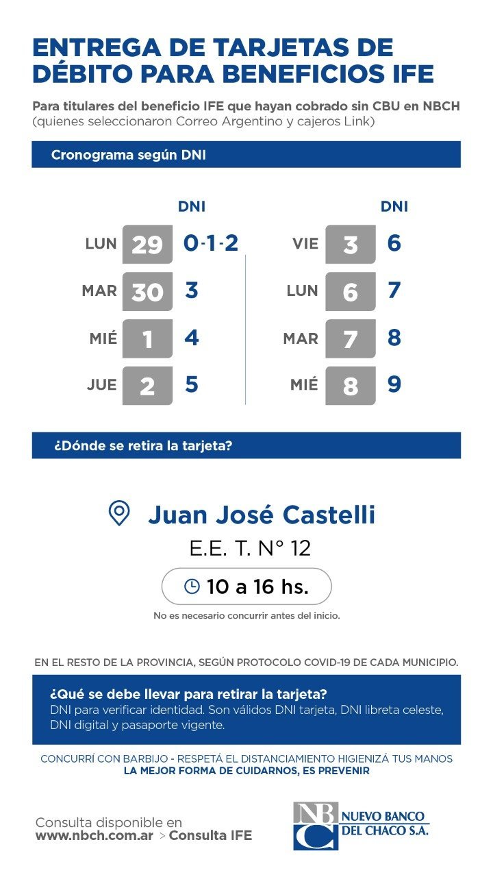 CASTELLI: NUEVO CRONOGRAMA DE ENTREGAS DE TARJETAS DE DEBITO PARA BENEFICIARIOS IFE