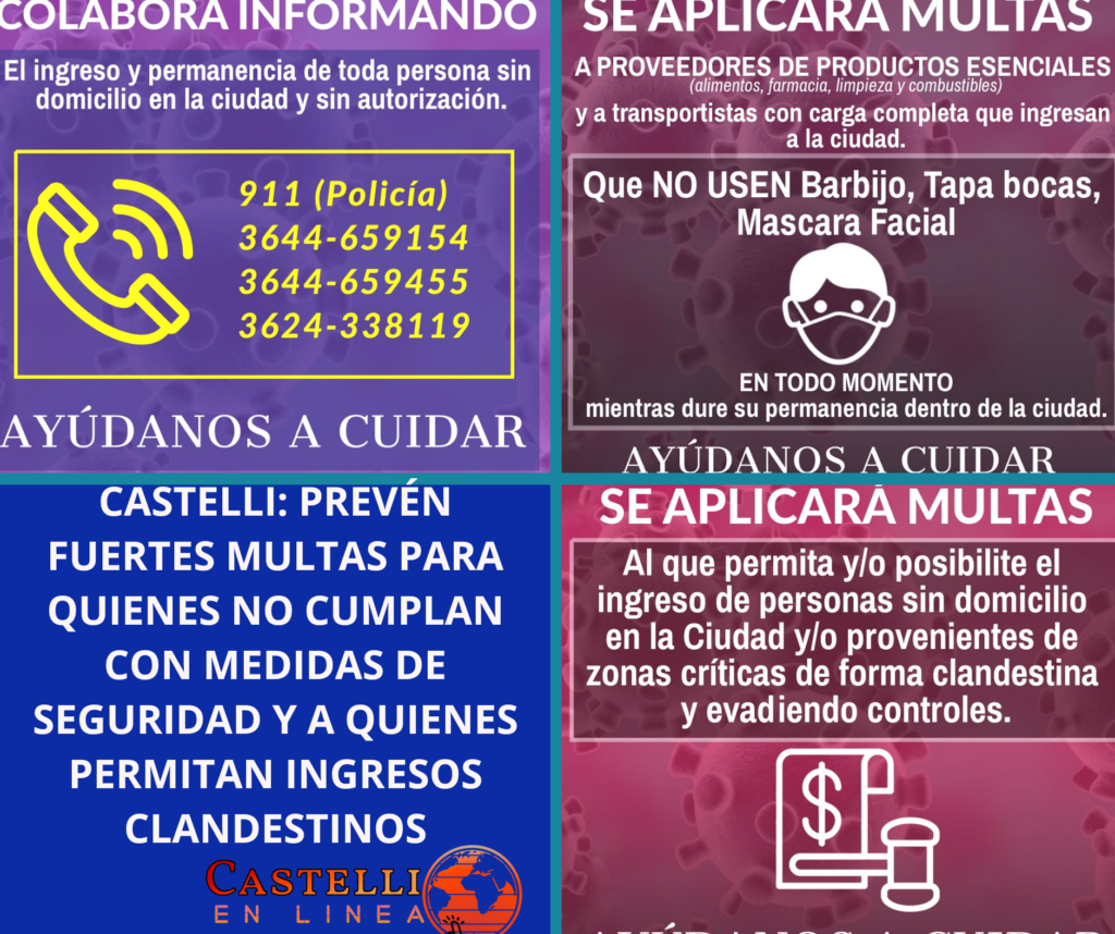 Las medidas preventivas previstas en el marco de la Pandemia por el CORONAVIRUS COVID-19 se endurecen para quienes deban ingresar a Castelli.