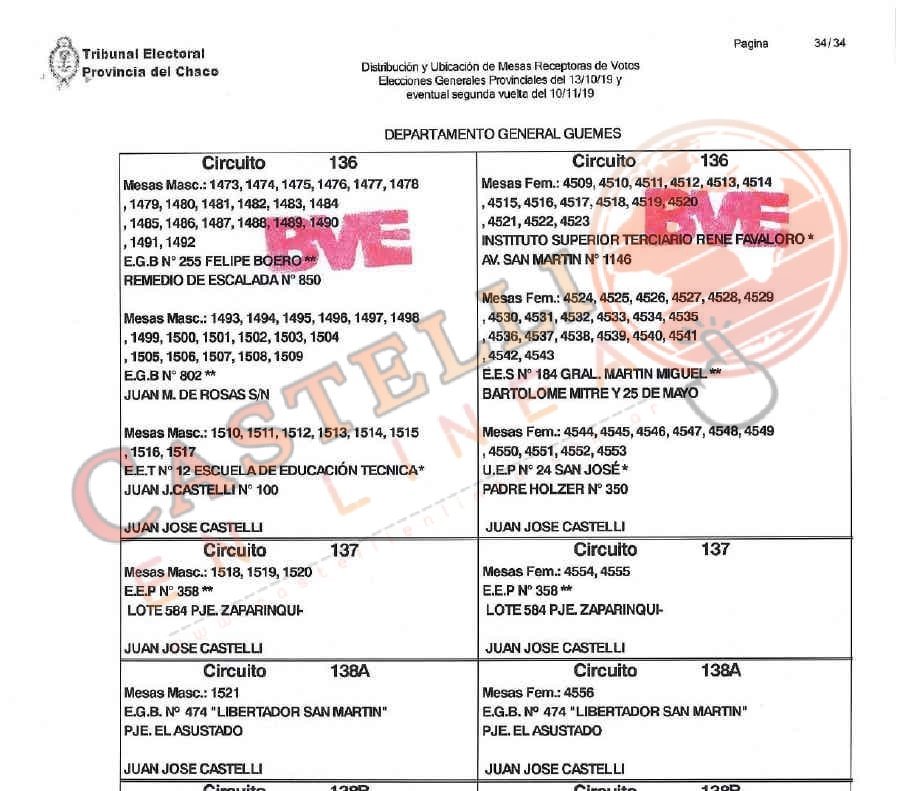 En cuanto a la cantidad de mesas dentro de cada localidad, el Tribunal Electoral informó que se trata de 318 mesas de un total de 831 en Resistencia, 33 de 152 en Barranqueras, 23 de 96 en Fontana, 23 de 93 en General San Martín, 34 de 128 en Villa Ángela, 47 de 267 en Sáenz Peña, 32 de 94 en Quitilipi, 22 de 85 en Machagai, 32 de 80 en Las Breñas, 29 de 90 en Charata, 35 de 97 en Castelli, 16 de 38 en Presidencia La Plaza, 16 de 34 en Miraflores, 18 de 30 en Pampa del Infierno, y la totalidad de mesas en Margarita Belén que suman 22.