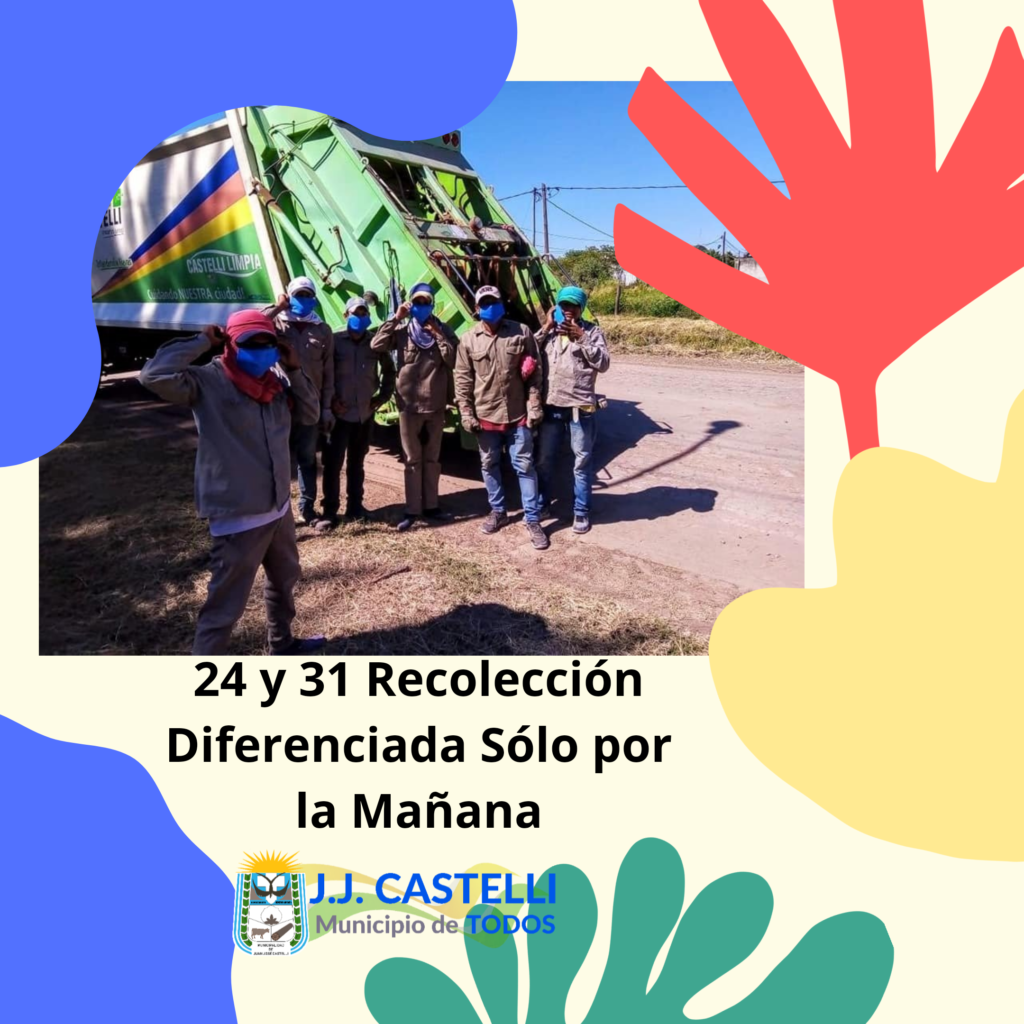 La Municipalidad de Juan José Castelli comunica que los días 24 y 31 de diciembre respectivamente se brindarán los Servicios Básicos, en cuanto a la Recolección de Residuos se realizará solo en el horario de la mañana, el sector al que le corresponde esos días a la tarde se pasará en el horario de 10 a 13 horas.