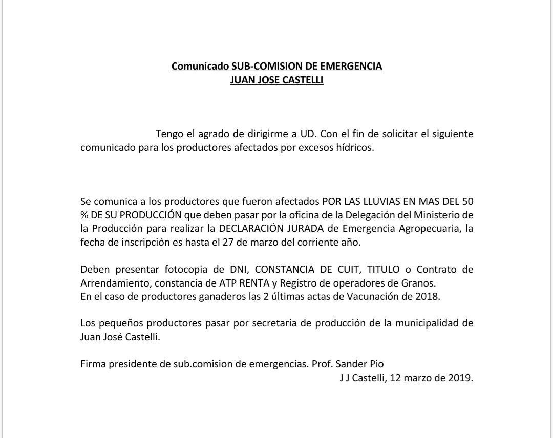 Se comunica a los productores que fueron afectados POR LAS LLUVIAS EN MAS DEL 50% DE SU PRODUCCIÓN que deben pasar por la oficina de la Delegación del Ministerio de la Producción para realizar la DECLARACION JURADA de Emergencia Agropecuaria, la fecha de inscripción es hasta el 27 de marzo del corriente año.