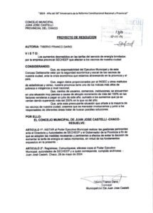 CON AUTORÍA DEL CONCEJAL FRANCO TIBERIO EL CONCEJO DELIBERANTE DE CASTELLI SOLICITA AL EJECUTIVO GESTIONAR EL CESE DE AUMENTO DESMEDIDO DE LAS TARIFAS DE SECHEEP