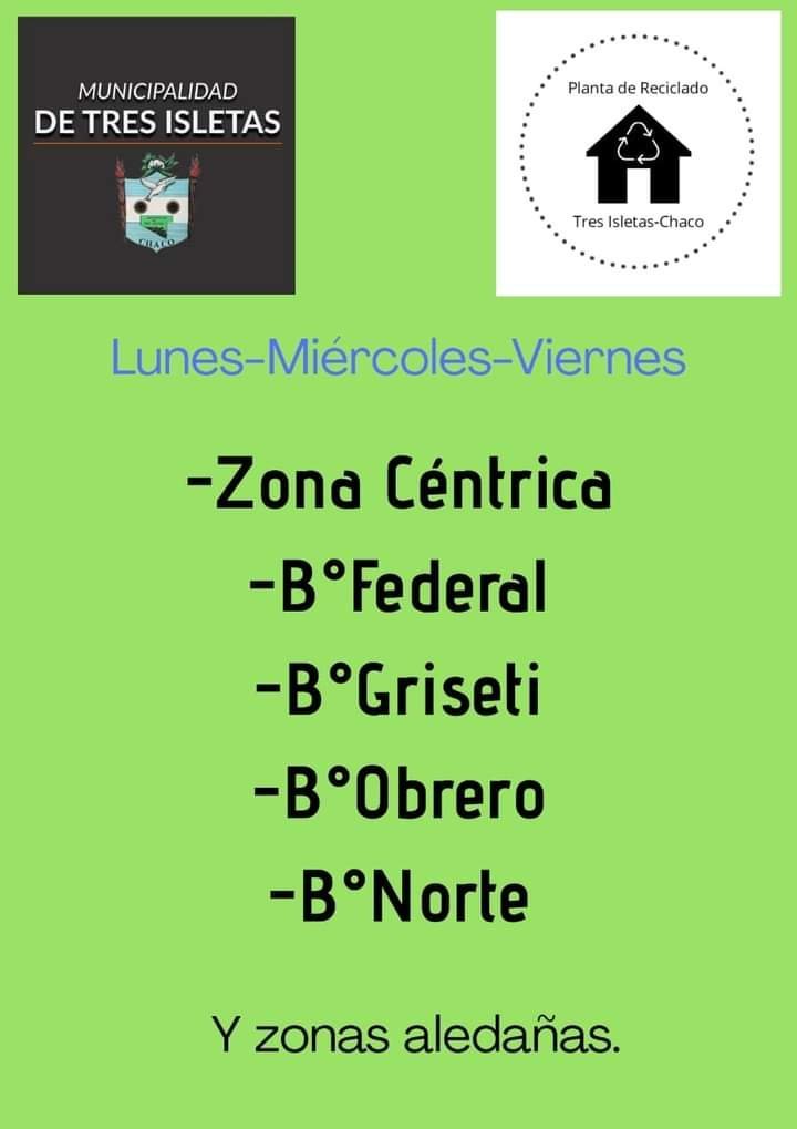Tres Isletas tiene una Planta de Separación de Residuos para el posterior Reciclado y desde la Municipalidad se busca concientizar a la comunidad en general para que los vecinos colaboren separando en sus domicilios los materiales que se pueden reciclar para hacer la recolección exclusiva. Esto significa que a partir de ahora, en la ciudad se realizará por separado la recolección de «residuos» y «separados».