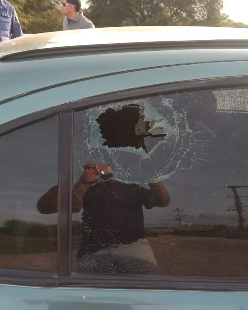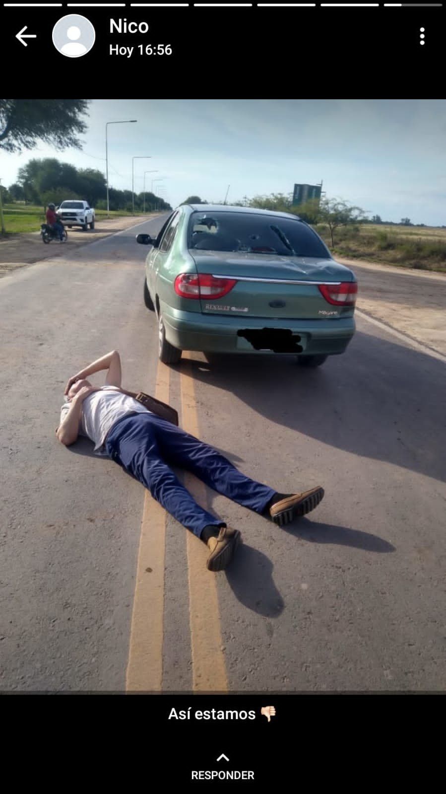 Fue este jueves promediando la hora 16:25 aproximadamente, cuando el conductor de un automóvil Renault Megane, color verde claro acompañado de dos femeninas mayores de edad, de manera sorpresiva ingresa desde el camino vecinal del Pje. El 44 y acelera velozmente la marcha, atravesando la interrupción llevada adelante por el grupo de personas existente, pasando sobre las ramas, poniendo en riesgo la integridad de los manifestantes, quienes debieron dispersarse inmediatamente para evitar ser embestidos por el vehículo, provocando que éstos reaccionen con violencia contra el automóvil, lanzando todo tipo de objetos contundentes, los que impactaron en el vidrio de la luneta, ventanilla derecha trasera y baúl, que ocasionaron rotura de los vidrios y hundimiento de la estructura, recibiendo algunos golpes el conductor del automóvil, por lo que inmediatamente intervino el personal policial, neutralizando la situación y evitar males mayores. Las mujeres que transitaban en el automóvil se retiraron del lugar por sus propios medios, sin recibir lesiones. En tanto el conductor requirió asistencia del personal de salud y posteriormente trasladado.