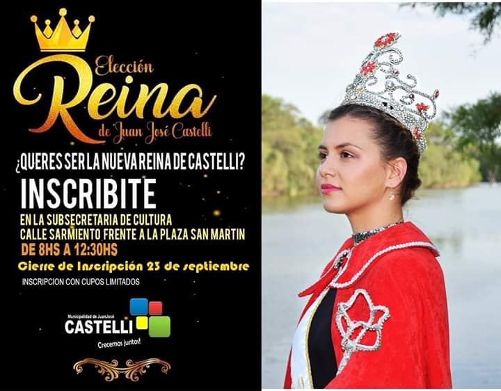 La Subecretaría de Cultura comunica que se encuentran abiertas las inscripciones para las interesadas en la elección de la Reina y Reinita de la Ciudad de Juan José Castelli. El evento tendrá lugar el sábado 28 de septiembre en horas de la noche, en el mega show que se desarrollará en la Plaza San Martín para toda la comunidad en el marco del 83º Aniversario que Cumplirá la Ciudad Portal del Impenetrable. Las aspirantes deberán presentarse en las instalaciones de la oficina de la Subecretaría, ubicada en Sarmiento 450, frente a la Plaza Central, en el horario de 8 a 12:30. Los requisitos para ser candidata a Reina de la ciudad son tener entre 15 y 25 años y entre 6 y 9 años para ser Candidata a Reinita de la Ciudad y residir en Castelli con por lo menos 2 años con domincilio local.. Cabe destacar que este año la Reina de la Ciudad, Magalí Masson, hará entrega de su cetro a la flamante soberana 2019 – 2020.