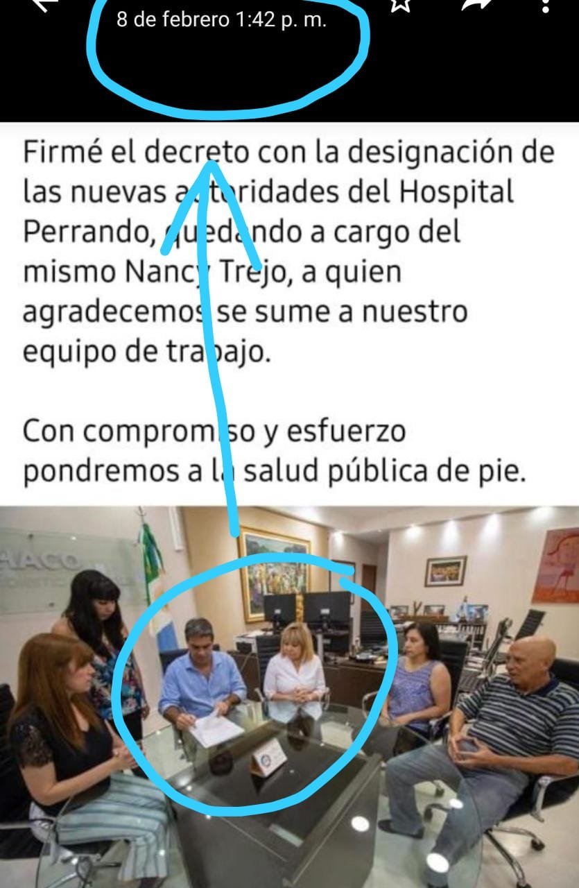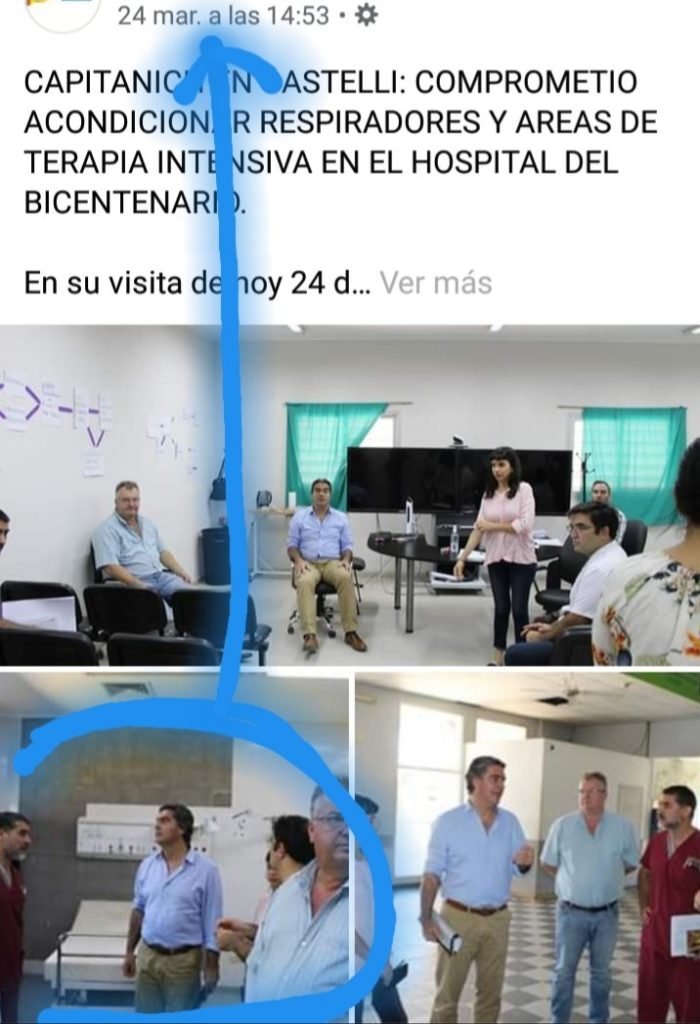 Una de esas publicaciones fue a raíz de la confirmación de COVID-19 de la Directora del Hospital Perrando. La publicación muestra al Gobernador de la Provincia firmando el Decreto de designación de la Dra Nancy Trejo como Directora. Allí se los puede ver a ambos. Y la otra fotos muestra al Gonernador en su visita al Hospital del Bicentenario en Castelli.