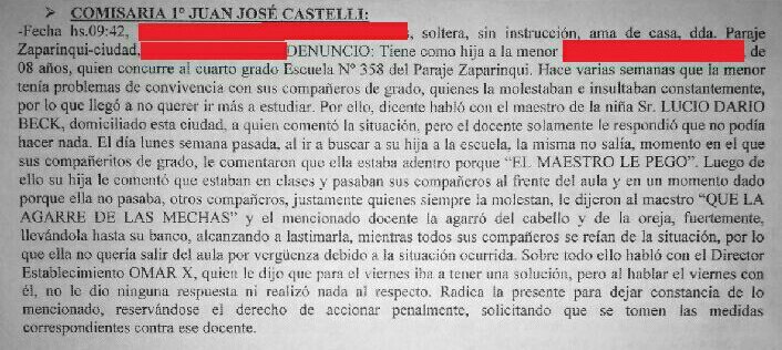 Fue en la Escuela de Educación Primaria N 358 de Zaparinqui. La madre de la niña radicó la denuncia penal en la Comisaría 1ra de Castelli Contra un docente. Según relató la mujer el educador habría maltratado a su hija menor de edad.