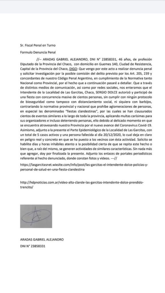 El diputado Alejandro Aradas denunci贸 penalmente al intendente Dolce de Las Garcitas por autorizar y participar de una fiesta prohibida por decretos provinciales y nacionales. Lo hizo ante la fiscalia en turno para que se investigue lo que es viral hoy en las redes sociales.