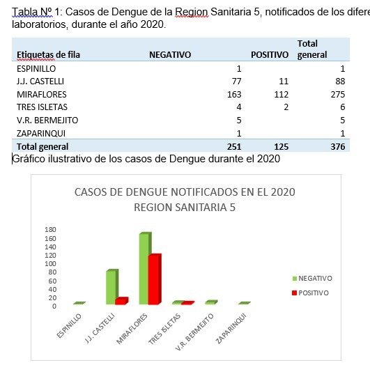 Tabla Nº 1: Casos de Dengue de la Region Sanitaria 5, notificados de los diferentes laboratorios, durante el año 2020.