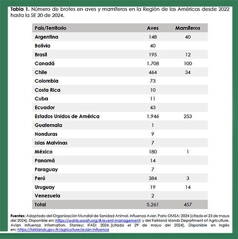 Tras la detección del virus de influenza A(H5N1) en las Américas en 2021, el mismo se ha detectado a lo largo de todo el continente (7, 8, 9).  Desde 2022 y hasta la semana epidemiológica (SE) 20 del 2024, un total de 19 países y territorios de la Región de las Américas reportaron a la OMSA 5.261 brotes de influenza aviar en aves domésticas y silvestres: Argentina, el Estado Plurinacional de Bolivia, Brasil, Canadá, Chile, Colombia, Costa Rica, Cuba, Ecuador, los Estados Unidos de América, Guatemala, Honduras, las Islas Malvinas, México, Panamá, Paraguay, Perú, Uruguay y la República Bolivariana de Venezuela.