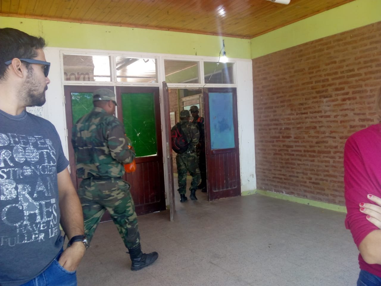 Las docentes denuncian, atropello, que custodian la escuela con armas. La denuncia la radica una docente en la comisaria y otra en juzgado multifuero, donde dicen que personas identificadas con la guardia comunitaria Wichi se encuentran dentro del establecimiento educativo WICHI según les dijeron por orden de su JEFE Arial Fabian, a pedido del Director Borda, las imágenes muestran a personas de los pueblos Wichi con arma y con cachiporra dentro del establecimiento educativo.