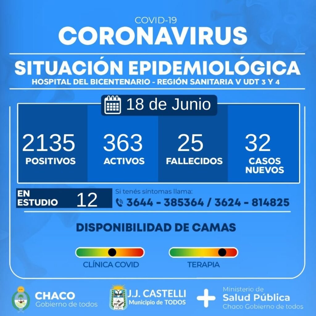 Tras la disparada de casos positivos que ya asciende a 2135 con 363 activos, Castelli registrĂł este viernes 2 personas fallecidas y 32 nuevos casos positivos.