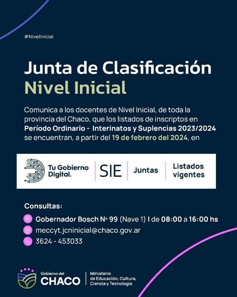 *El gobierno del Chaco, a través del Ministerio de Educación y las Juntas de Clasificación de Nivel Inicial, comunica a docentes de toda la provincia, que los listados de inscriptos en Período Ordinario “A” de Interinatos y Suplencias 2023/2024, se encuentran en la Aplicación SIE de la plataforma Tu Gobierno Digital, específicamente, en los listados vigentes de la sección Juntas, a partir de hoy, lunes 19 de febrero.*