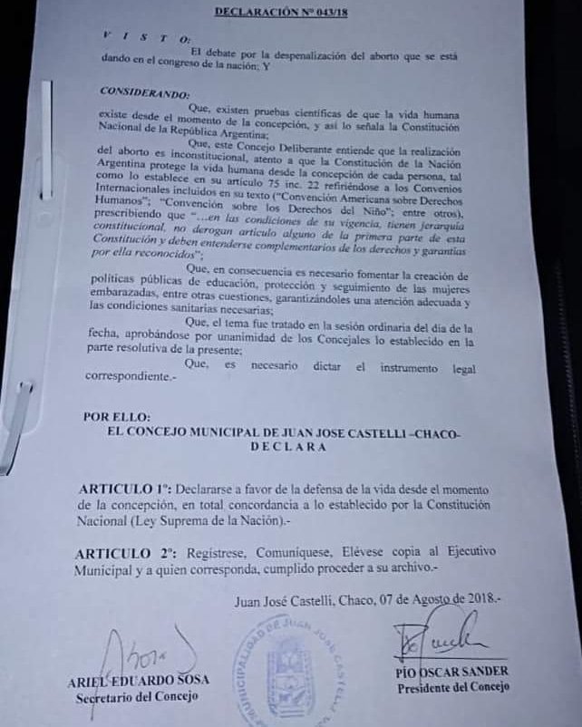 El Concejo Deliberante de Juan Jose Castelli en su sesi贸n del 07 de agosto de 2018 se declar贸 a favor de la vida.