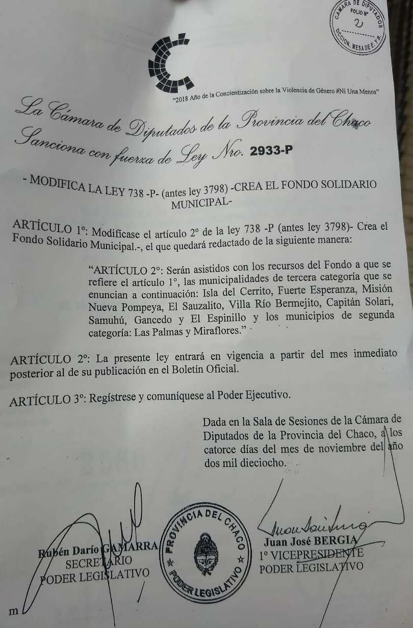 ARTÍCULO 1°: Modificase el artículo 2° de la ley 738 -P (antes ley 3798)- crea el Fondo Solidario municipal., el que quedará redactado de la siguiente manera: “ARTÍCULO 2° : Serán asistidos con los recursos del Fondo a que se refiere el artículo 1°, las municipalidades de tercera categoría que se enuncian a continuación: Isla del Cerrito, Fuerte Esperanza, Misión Nueva Pompeya, El Sauzalito, Villa Río Bermejito, Capitán Solari, Samuhú, Gancedo y El Espinillo y los municipios de segunda categoría: Las Palmas y Miraflores.»
