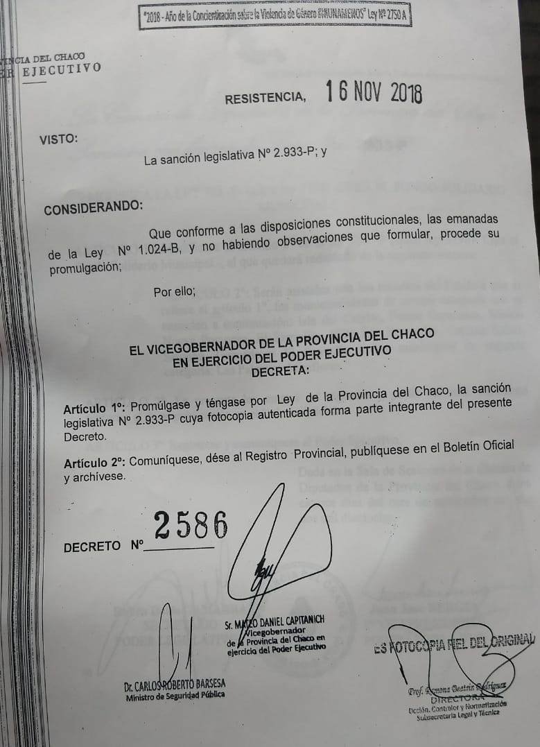 DECRETO N° 2586 firma MATEO DANIEL CAPITANICH vice gobernador de la provincia del Chaco en ejercicio del poder ejecutivo.