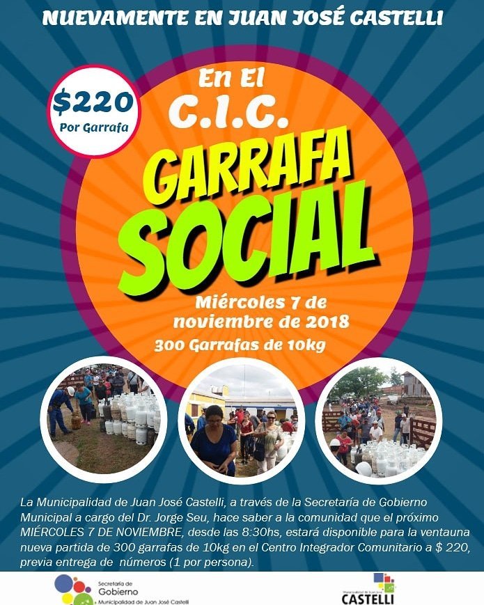 Desde la Secretaría de Gobierno municipal a cargo del Dr. Jorge Seu, se hace saber a la comunidad que el próximo MIÉRCOLES 07 DE NOVIEMBRE DE 2018, a partir de las 8:30 hs en el Centro Integrador Comunitario (CIC), estarán disponibles para la venta, previa entrega de números (1 por persona) 300 (trescientas) garrafas de 10kg a $220 cada una.