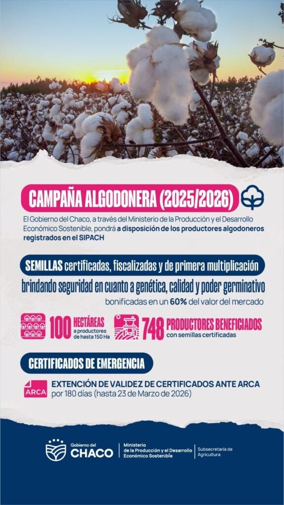 La iniciativa permitirá adquirir bolsas de semillas certificadas, fiscalizadas y de primera multiplicación con una bonificación del 60% sobre el valor de mercado, con el fin de acompañar la siembra de la campaña algodonera 2025/2026.