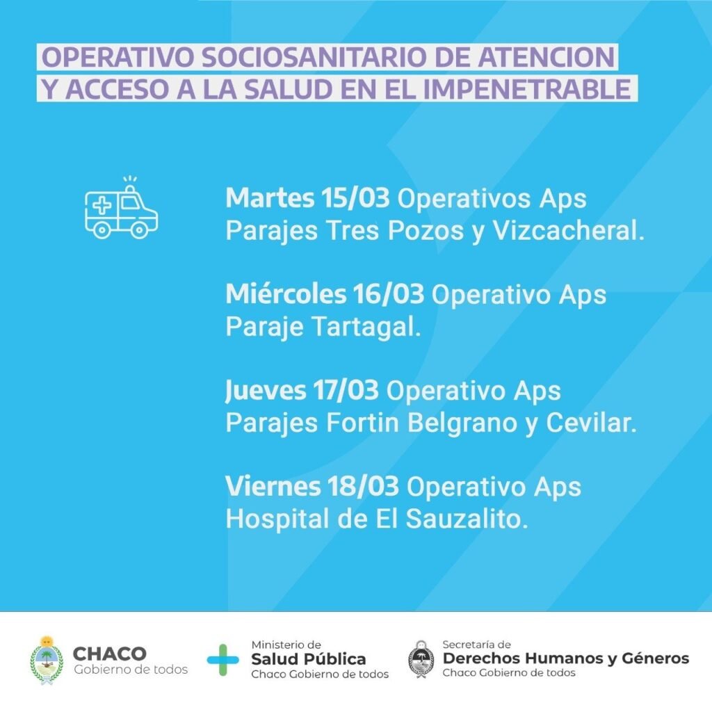 El gobierno provincial, a través del Ministerio de Salud Pública y la Secretaría de Derechos Humanos y Géneros, con el acompañamiento de la Vicegobernación y en articulación con el Frente Patria Grande, llevará adelante desde el lunes 14 al viernes 18 de marzo un nuevo operativo integral de asistencia y atención primaria de la salud en El Impenetrable.