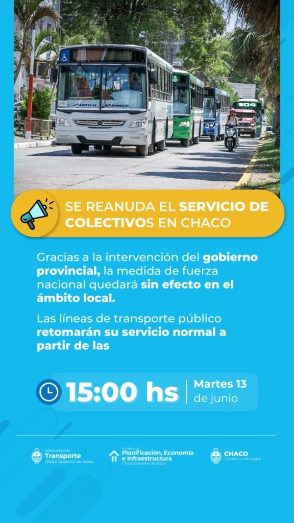 A pesar de la medida nacional determinada por la Unión Tranviarios Automotor y gracias a las gestiones del Gobierno provincial, se logró llegar a un acuerdo con la delegación local del sindicato para dejar sin efecto el paro en el servicio y garantizar que más de 60.000 pasajeros y pasajeras del Chaco no se vean afectados por la situación.