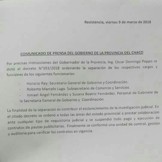 El vicegobernador a cargo del Poder Ejecutivo provincial, Daniel Capitanich, firmó el Decreto Nro. 393/2018, que resuelve separar de sus cargos a los funcionarios afectados por la denuncia de evasión y lavado de activos.