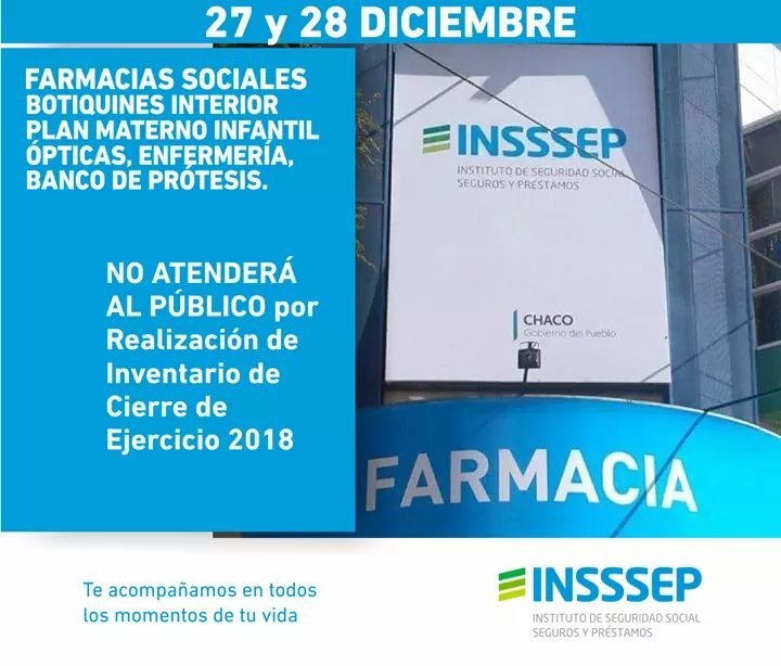 El INSSSEP comunica a sus afiliados que sus Farmacias y Botiquines, Plan Materno Infantil, Ópticas, Banco de Prótesis y EnfermerÃa de toda la provincia cerrarán el Jueves 27 y Viernes 28 de Diciembre por inventario de cierre de Ejercicio 2018 de productos farmacéuticos y afines