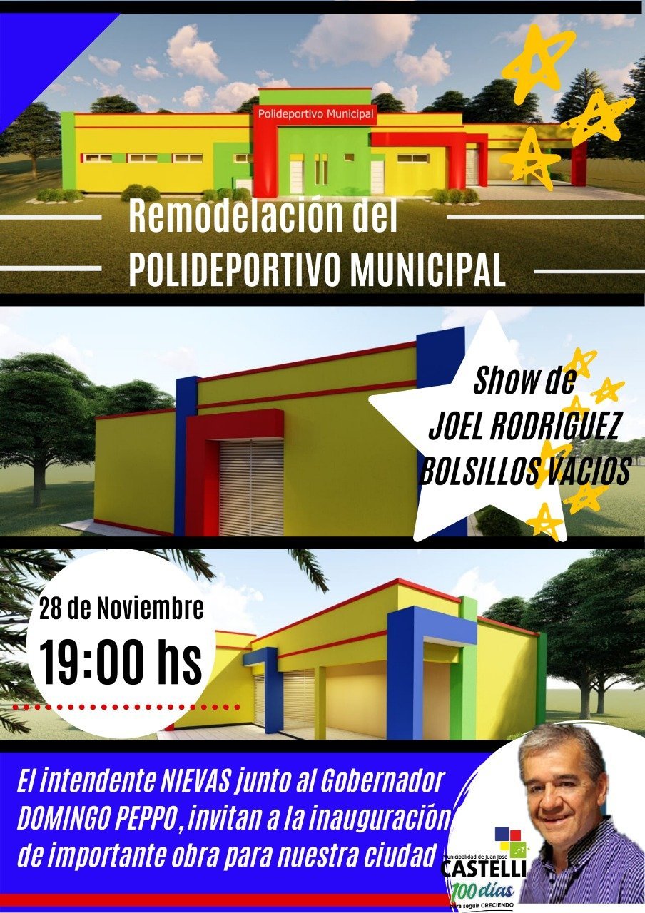 este jueves a las19 hs el Intendente de Castelli, Beto Nievas junto al Gobernador Oscar Domingo Peppo, inaugurarán emblemáticas obras en el Polideportivo Municipal. Luego dejarán inaugurada la iluminación en el Acceso Norte de la ciudad.