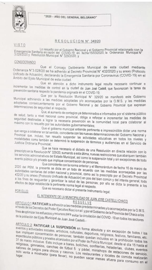 A través de la Resolución 348/20 que lleva las firmas del Intendente Pio Sander y el Secretario de Gobierno Ismael Barnes, el Municipio de Juan José Castelli ratifica la suspensión absoluta y sin excepción de todos los eventos y actividades sociales, artísticos, culturales, deportivos, religiosos, festivos, familiares, etc. que impliquen concentración de personas desde el 16 al 31 de marzo.