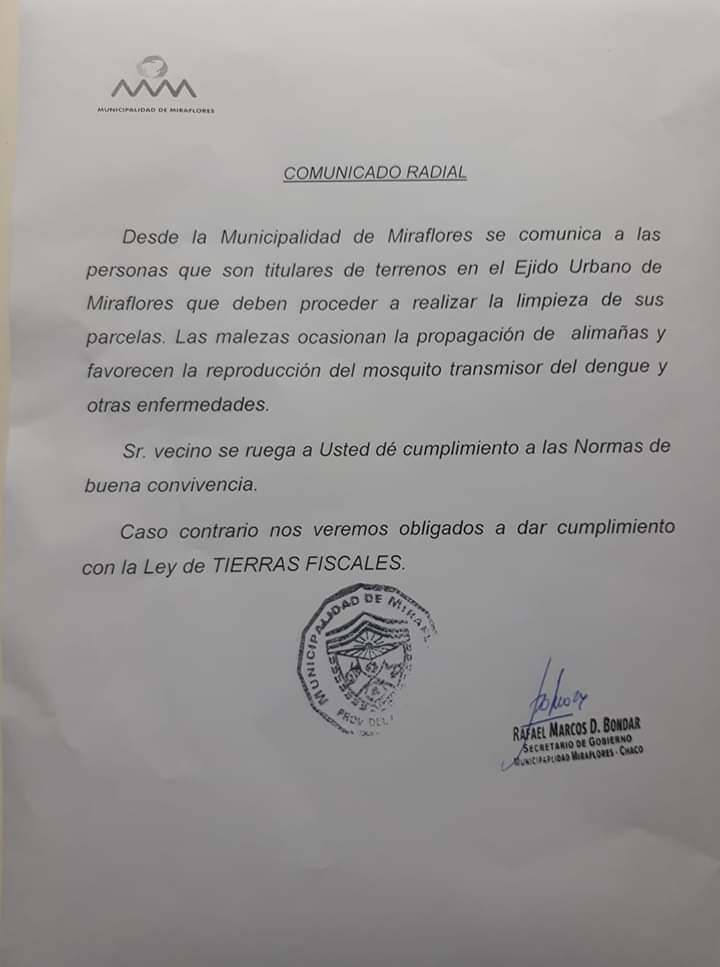 Desde la municipalidad de Miraflores se comunica a las personas que son titulares de terrenos en el ejido urbano de Miraflores deben proceder a realizar la limpieza de sus parcelas.