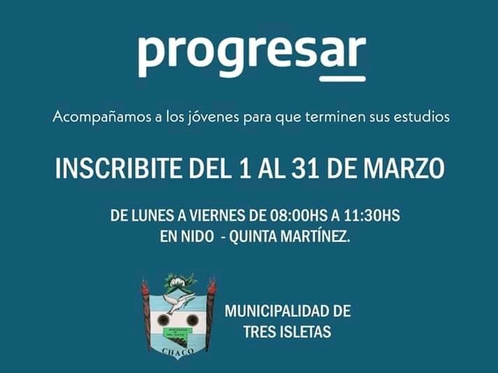 La Municipalidad de Tres Isletas comunica que pueden inscribirse para las Becas ProgresAR del 01 al 31 de marzo de 8 a 11:30 hs en el NIDO.